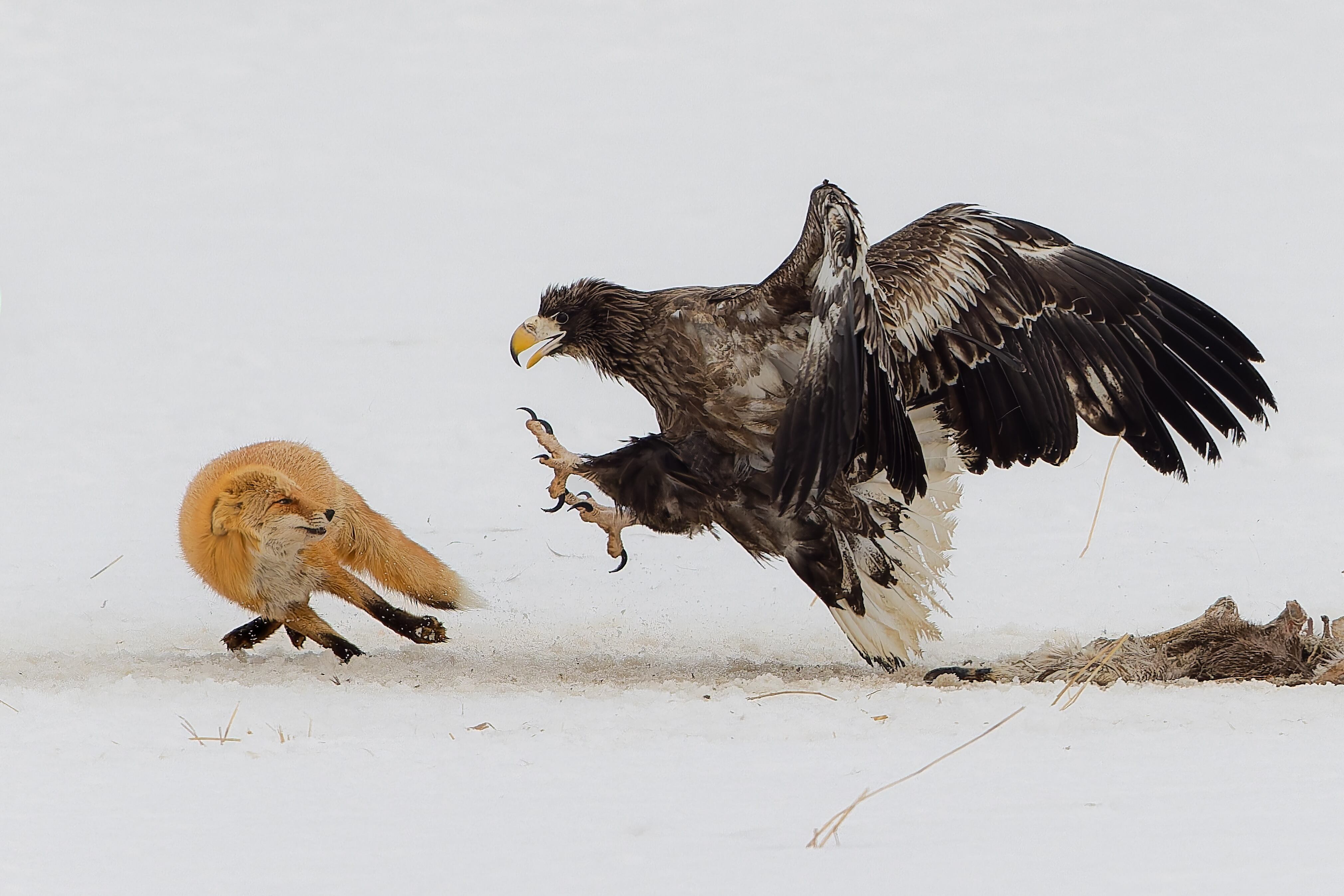 北海道の雪原で捉えた、キタキツネとオジロワシの緊張の瞬間。